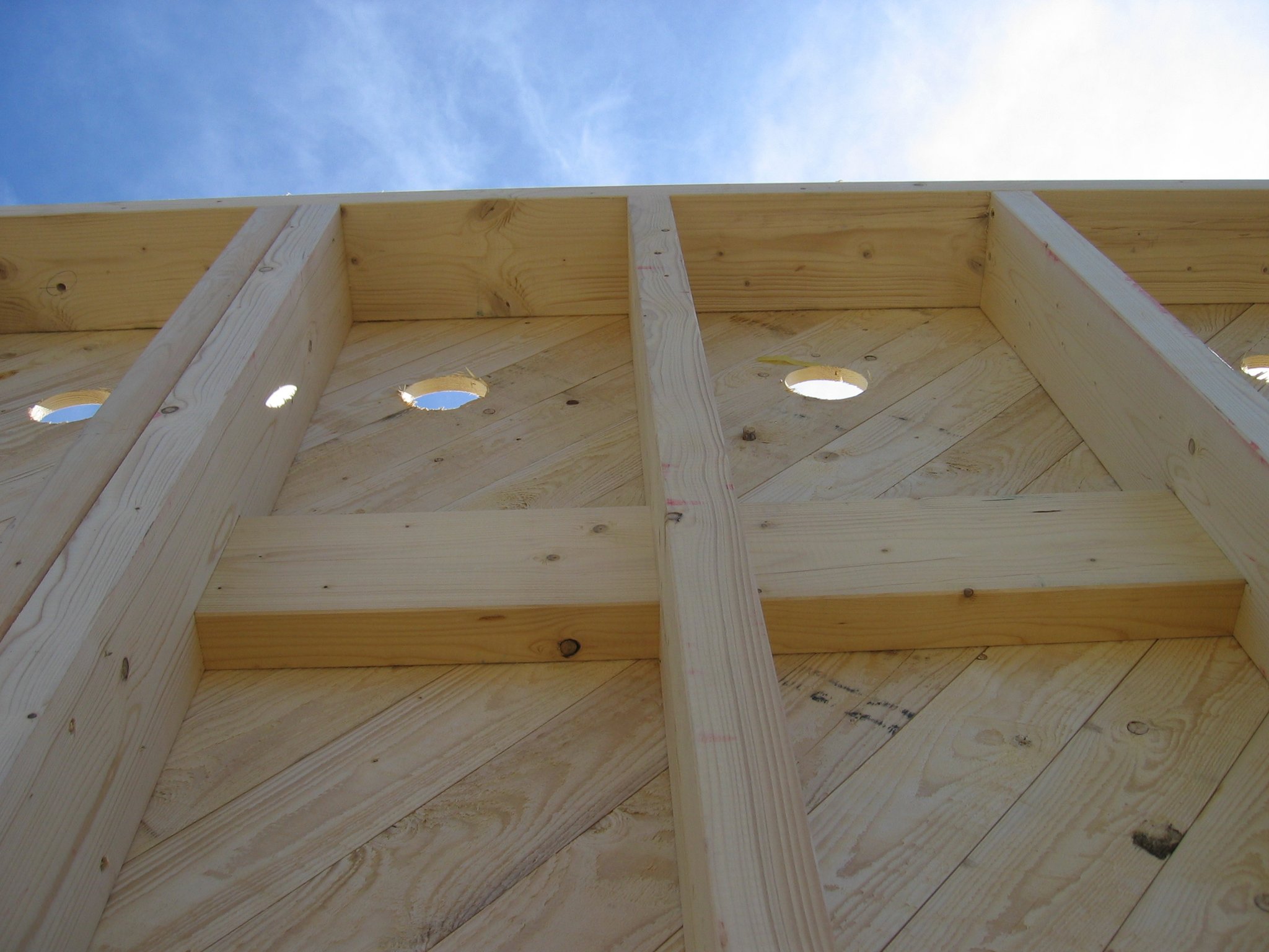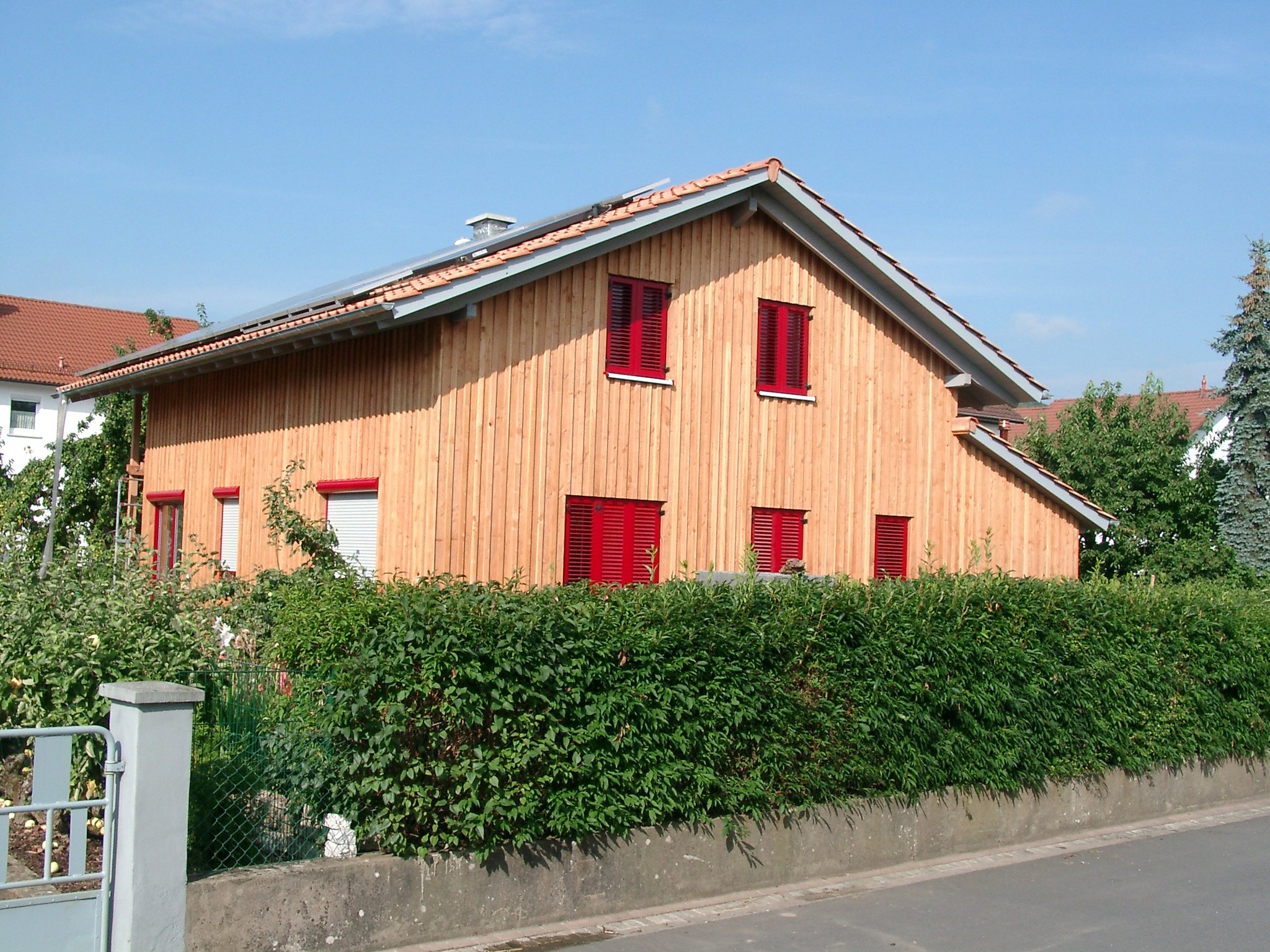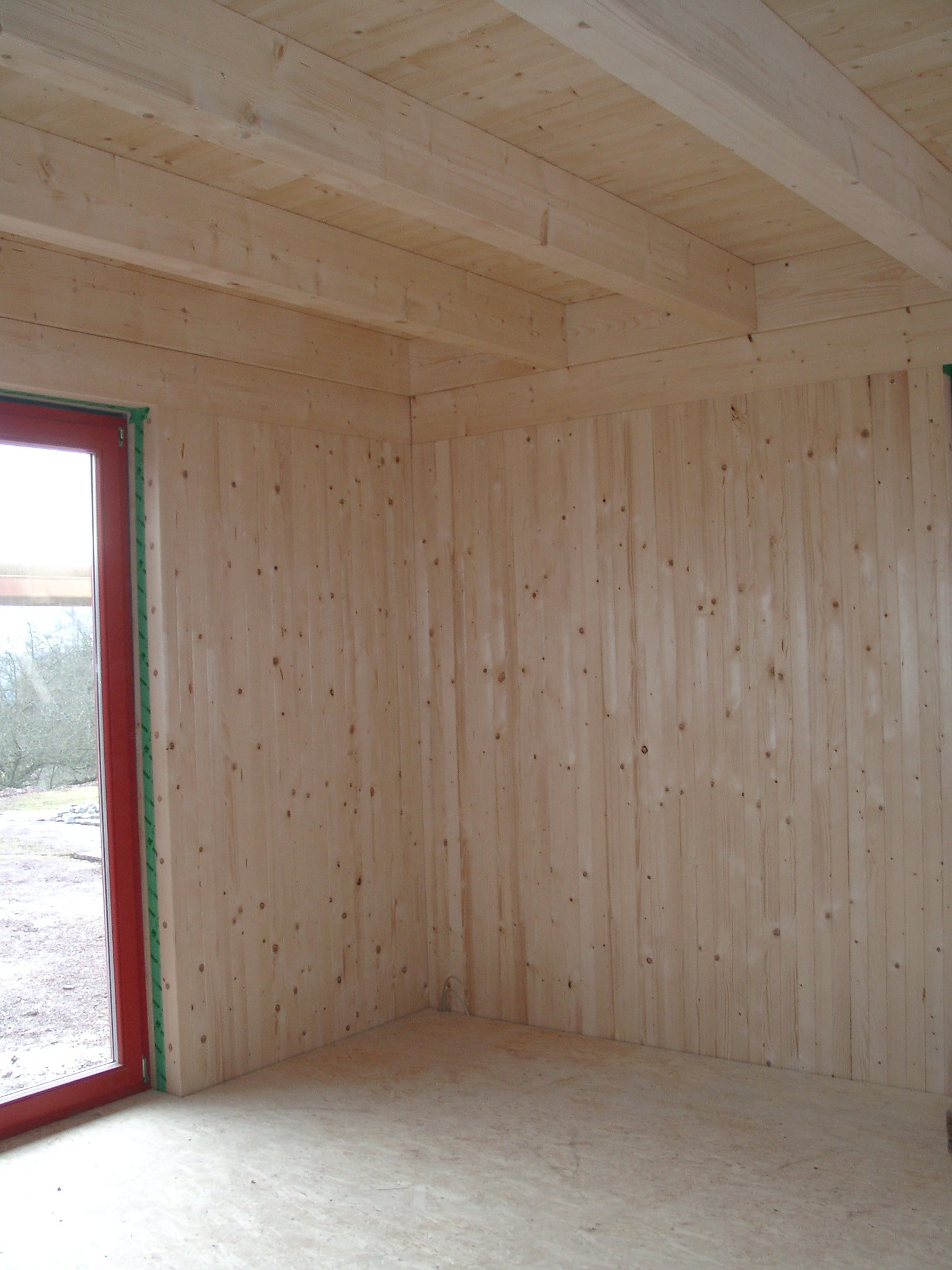 Diese Verkleidung ("Beplankung") erfolgt meist mit diagonal verschalten Brettern - also ausschließlich mit Holz. Der Vorteil: keine schädlichen Ausgasungen von künstlichen Plattensystemen beeinträchtigen die Innenluft .