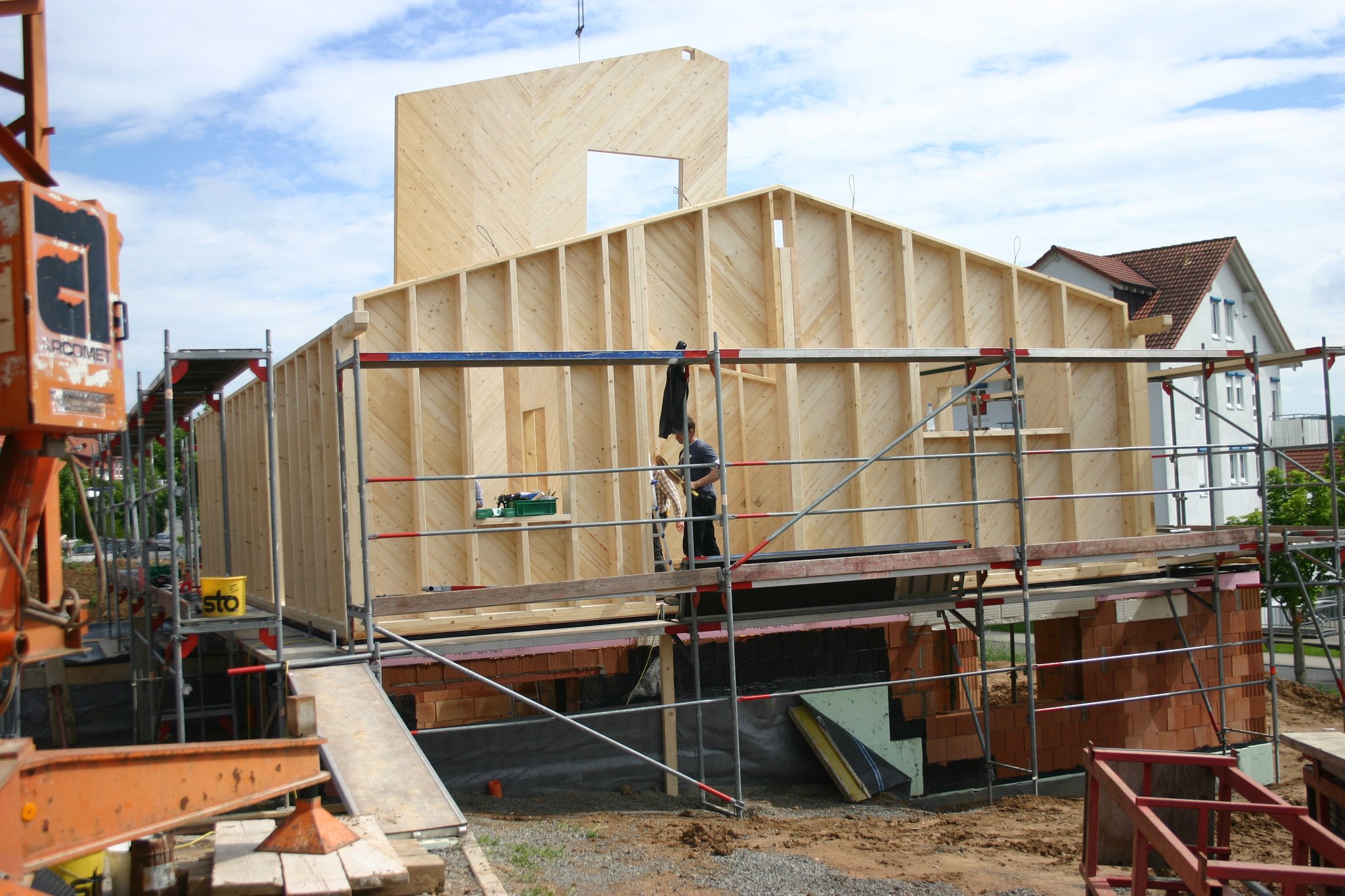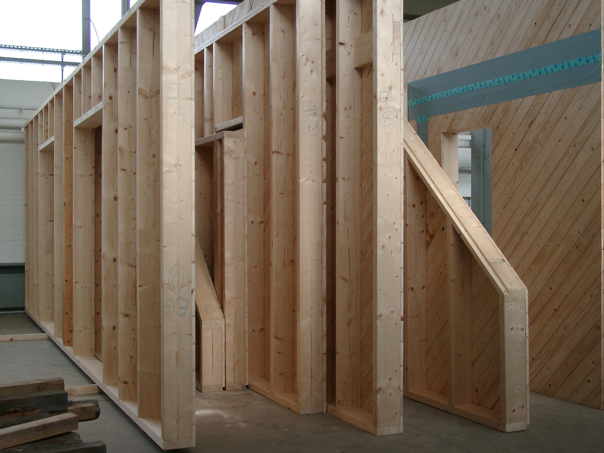 Wand-, Decken und Dachelemente werden in der Werkstatt vorgefertigt. Diese bestehen aus einem tragenden Holzgerüst (der sog. Rahmen), welches ein- oder beidseitig verkleidet wird.